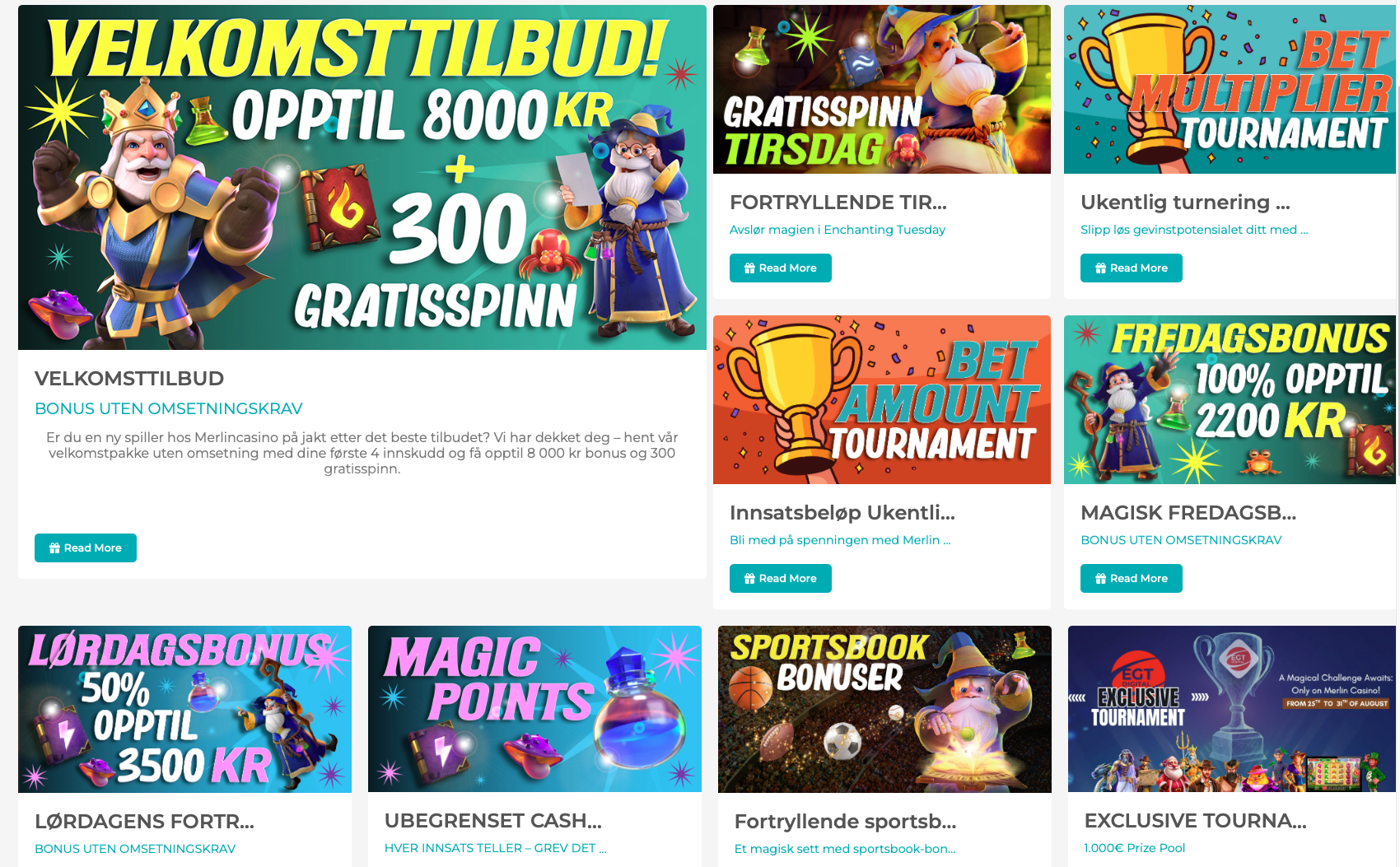 I tillegg til velkomstpakken tilbyr Merlin Casino en rekke faste kampanjer, lojalitetspoeng og turneringer som sørger for at spenningen varer lenge etter den første innskuddsbonusen.