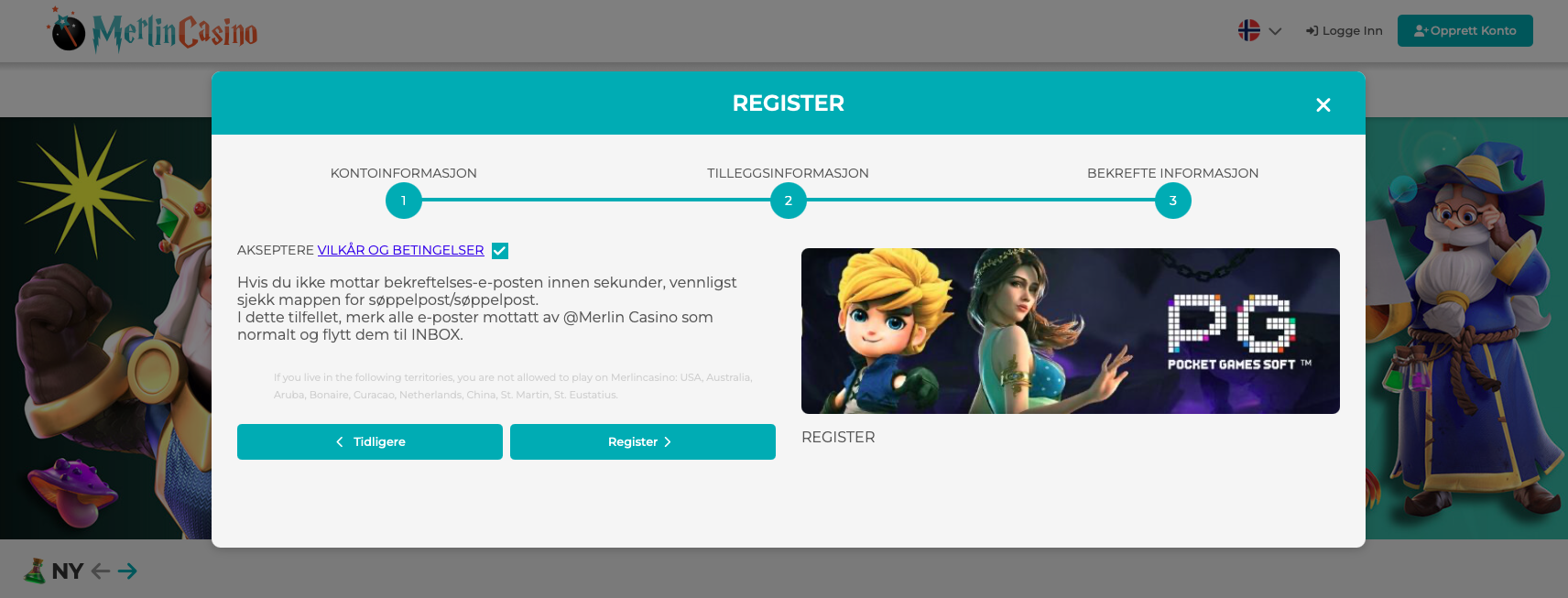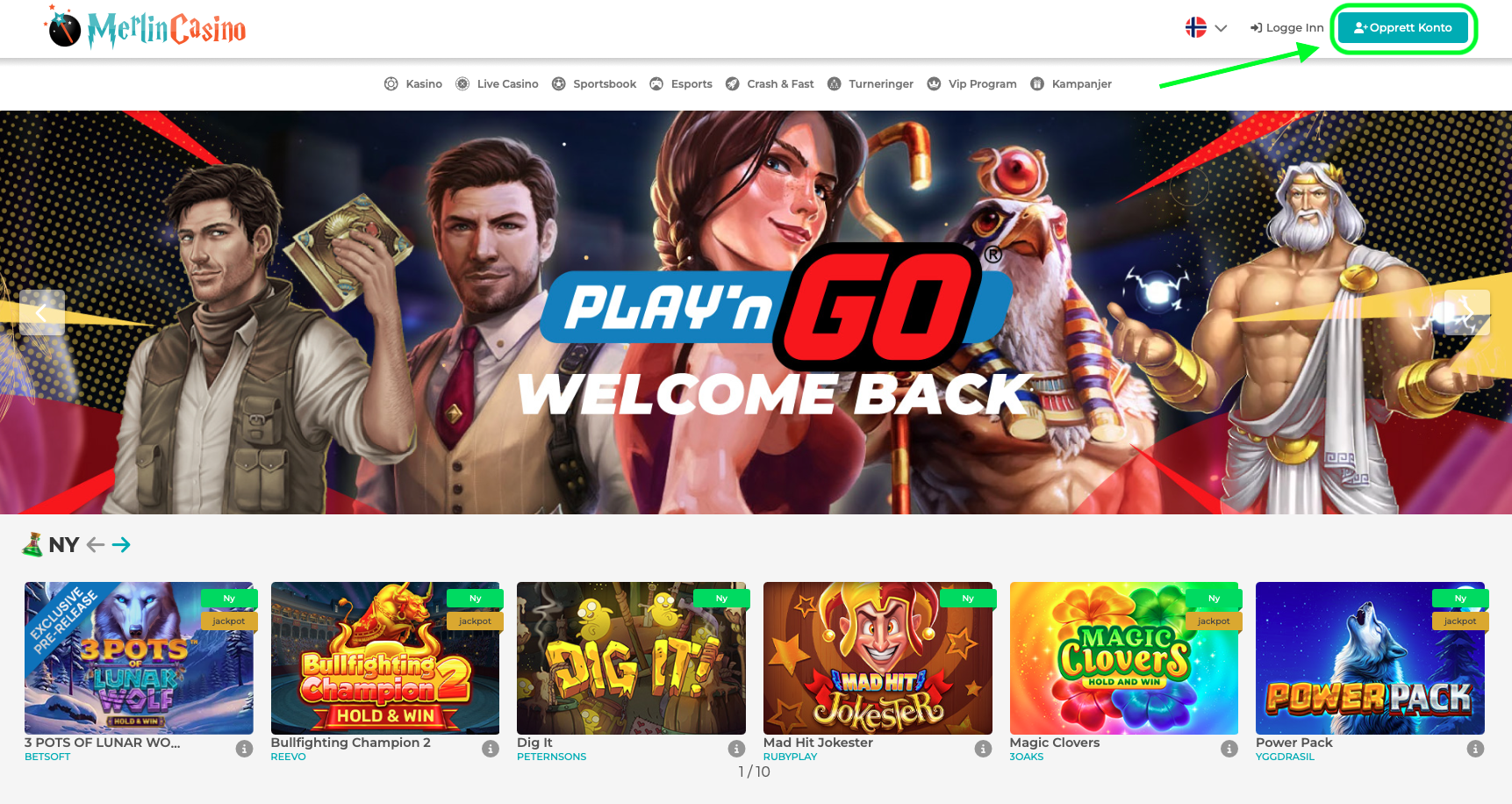 Registreringen på Merlin Casino er både rask og intuitiv. Prosessen starter med et tydelig “Registrer deg”-ikon øverst på siden.