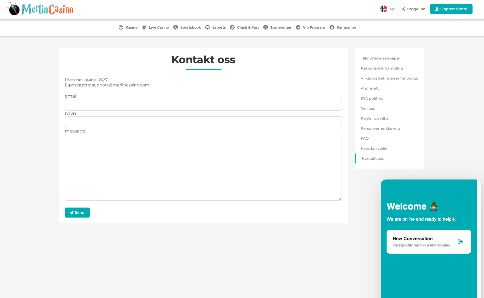 Når det gjelder kundeservice, leverer Merlin Casino solid. Vi testet live chat flere ganger, og responstiden var alltid under 30 sekunder. Svarene vi fikk var profesjonelle og konkrete.