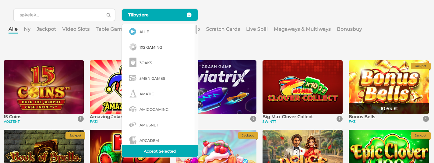- Jackpotspill – Progressive jackpoter fra blant annet NetEnt og Microgaming, hvor gevinster kan nå millioner.