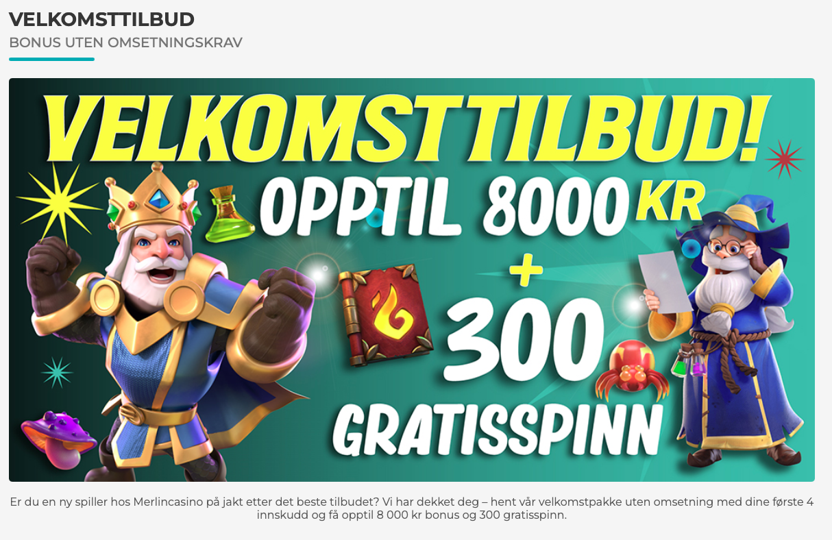 Som ny spiller får du dessuten 20 gratisspinn uten innskudd samt en velkomstpakke som kan gi opptil 8000 kr + 300 gratisspinn fordelt over fire innskudd. Denne kombinasjonen gjør at du får en svært god start, enten du vil teste ut plattformen risikofritt eller gjøre et større førsteinnskudd.